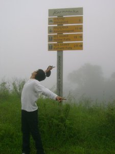 After such fantabulous sights, we reached Kemmanagundi, which is called a ‘hill station’ in itself. The guard takes 5 bucks a person and lets us in. We parked our car much before we reached the entrance coz we saw a number of other vehicles parked there. Kemmanagundi, in itself is a mixed bag of tourist places and attractions – Rose Garden, Rock Garden, a cafeteria, a waterfall and the most wonderful sight — the Z point, which is reached after trekking 20 minutes and you can see the entire valley from up there. We were charged and ready to walk the first 3 kms (which can be covered by car) and then the next 2 kms which is the climb to the Z point. Not interested in seeing the various gardens and parks, we focussed on reaching the Z point.