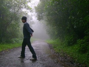 Well, lets rewind, a day before we left for Chikmagalur, i went to my office colleague who had been there a week back and asked him for tips etc. The first thing he said was, “Tanu, there are millions of Leeches in that area, be very very careful, carry Salt, Deo and wear very tight clothes so they dont crawl in…” and so we were ready with Salt and Deo.” Coming back to our present scenerio, hearing R scream, we ran to her. We had just crossed a very difficult puddle, which had turned my olive green sport shoes to RED! :S. R was standing at the edge of the waters and pointing to her shoes, which had about 5 leeches crawling up. We calmly took out Salt and sprinkled over her shoes and the bloody Leechs fell off.. phew!…oh no, wait, we didnt check our shoes and jeans….panic struck us and we frantically looked all around our clothings. We found a dozen more leeches on us and thanked R for announcing this, or else we would have reached the Z point with leeches stuck to our skins! yuck!…