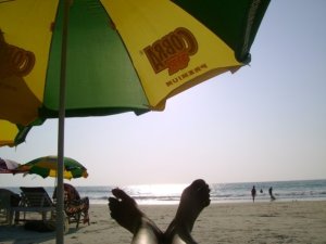 That was when we fell for the lure of the ocean and stopped at Colva…and may I say, that was the best decision we made. Soubhagya, when he had come to Goa earlier, had eaten at a place called ‘Kentuckee’ at Colva Beach..We were famished with all the travelling and no breakfast. So we decided to be wise and stopped at ‘Kentuckee’. It was a hot afternoon.. we were snappy and famished. We ordered Breezers, Feni and starters…ofcourse! We ate in silence till our bellies were full enough to start jabbering! J We enjoyed the afternoon sun, yearned for the beach and couldn’t wait to dig into the delicious foood…which when I call ‘delicious’ is actually ‘very very good’!! The chicken was succelent, the fish was very well cooked and the feni was Awesome! We finished our lunch by 3PM and hopped onto the Colva Beach.. it was quiet crowded..Mostly with the families and the kids and the so called ‘TT Golds/DMRs’ (our Pet Names for the pounchy leching uncles in dirty skin colour chaddis…yuck yuck!) We walked upto a Beach Shack on Colva which had 2 empty sunbeds and just when we were about to settle down, a very small man came running to us asking “yes… what do you want… 300/- per bed”. We said, “ok.. but can we have 2 chairs also please?” He refused point blank and said “No No…only 1 bed for 300/- and only 1 person per bed”.. Well WTF? I got a bit agitated… it was as if he was looking down upon us… and told him “can you please talk a bit politely and that there were some foreigners sitting nearby – 2 on one sunbed!!” His answer made us all fume – “Those are 15 days old…those are regulars…” We left but not before giving the man a good piece of our minds.