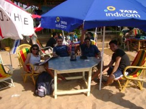 We bargained with the hotel guy – cum – Cab provider. We wanted to hire a car for the entire day and night, since we didn’t want to drive on New Year’s night, lest, some of us are too high (responsible citizens you see…we were!). We got the car and we were on our way to Baga Beach, Baby! We landed on the beach and couldn’t contain our excitements… One thing that we observed was the fact that there were – so few people!! I mean we actually got 2 sun-umbrellas and 5 chairs at a shack… wow! J It didn’t take us more than a minute to order our first rounds of Beer and the Golden-fried Prawns and the chicken somethings… All we did for the next 15 mins was “Sigh…we are finally here… sigh… smile…sigh…we are finally here…sigh sigh…smile widely… smile at the neighbour next door…sighhh!”