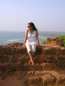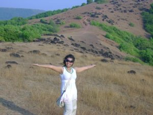 Having done that and stared at the innumerable eye-candies, we moved towards Chapora Fort. It was about 4PM and we had decided to watch the sunset from the fort. The climb up Chapora is not so wow… it was difficult especially if ur wearing ‘chappals’! hmph.. Nevertheless we reached the top and made our way to the ‘Dil Chahta Hai’ point. There were a number of Saifs and Amirs and Akshayes that we saw posing.. We waited for them to get off and went ahead with our posings. That is when we discovered a small opening, which leads to outside the fort area and towards a section of the mountain that a few men were going to. We decided to trek it. The walk was beautiful.. the view on both sides was breathtaking – one side was the Large Vagator Beach and the other side was a section of Goa which looked like a fishermen’s colony. We went to the farthest end of the mountain, from where it was just the sea and the skies! Sigh.. Settled on a rock, we watched the sun go down.. another great sunset added to our memories!