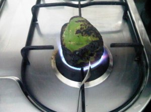 - Put a fork in the Green pepper and place it on the Gas Stove for 5 minutes, turning it around on all sides, till the skin blackens. Take it off the gas and put into a bowl of cold water. Peel off the skin with the blunt side of the knife and cut into thin strips.