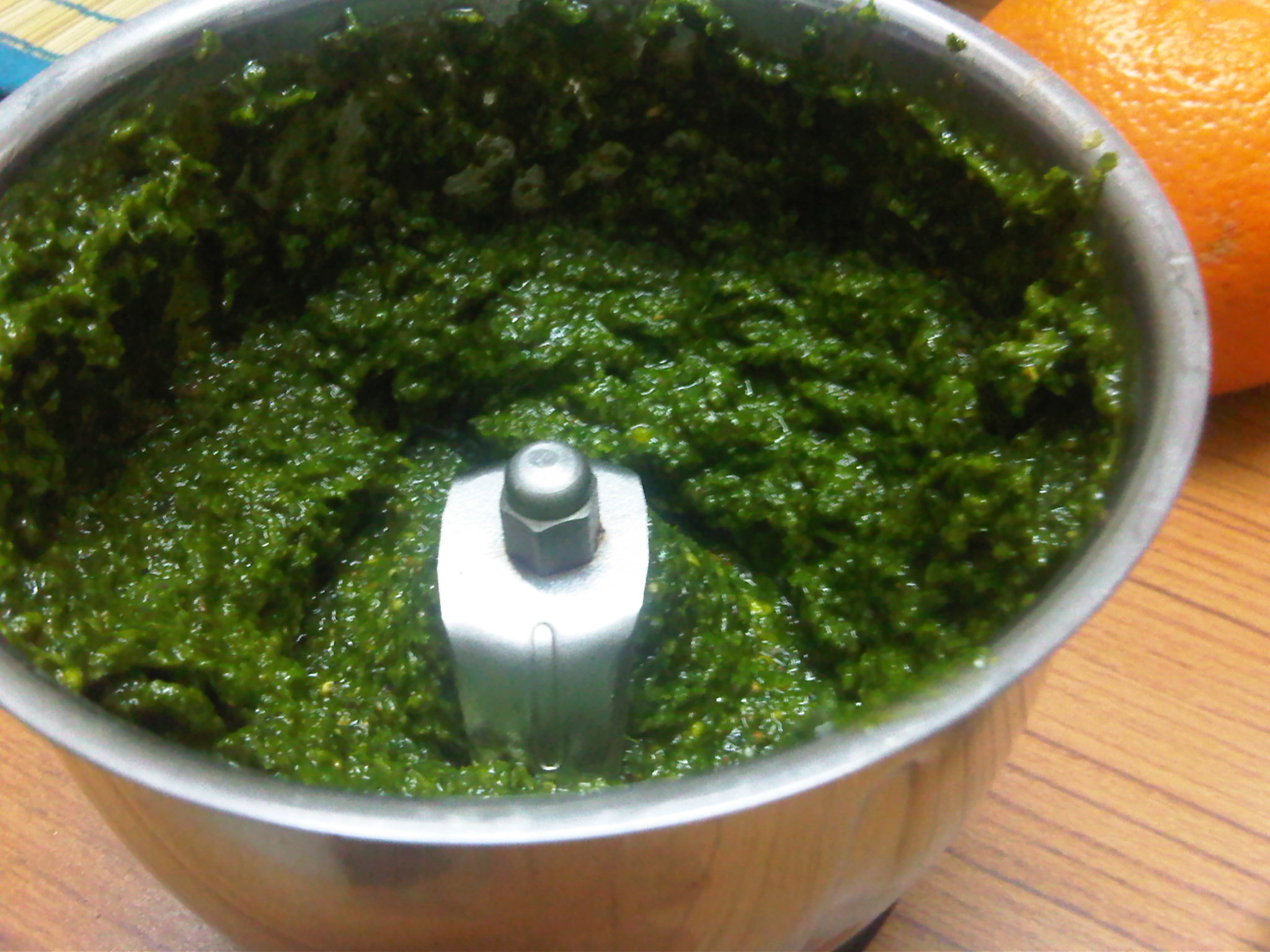 - Put all of the ingredients – Basil leaves, blanched Spinach, crushed garlic, lemon juice, salt, pepper and 3 tablespoons of olive oil in the Food processor and blend! Your sauce is ready!!