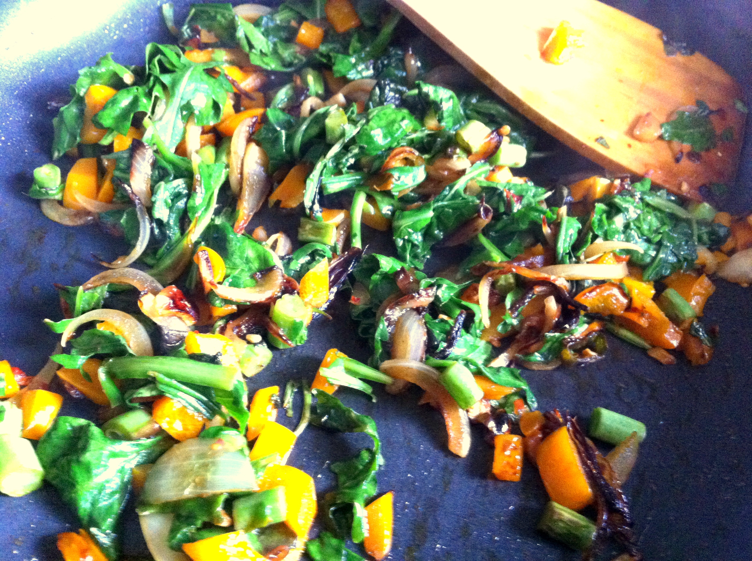 - Add the chopped spinach and arugula to it and sauté till you see the leaves have wilted. Usually takes about 1 minute.